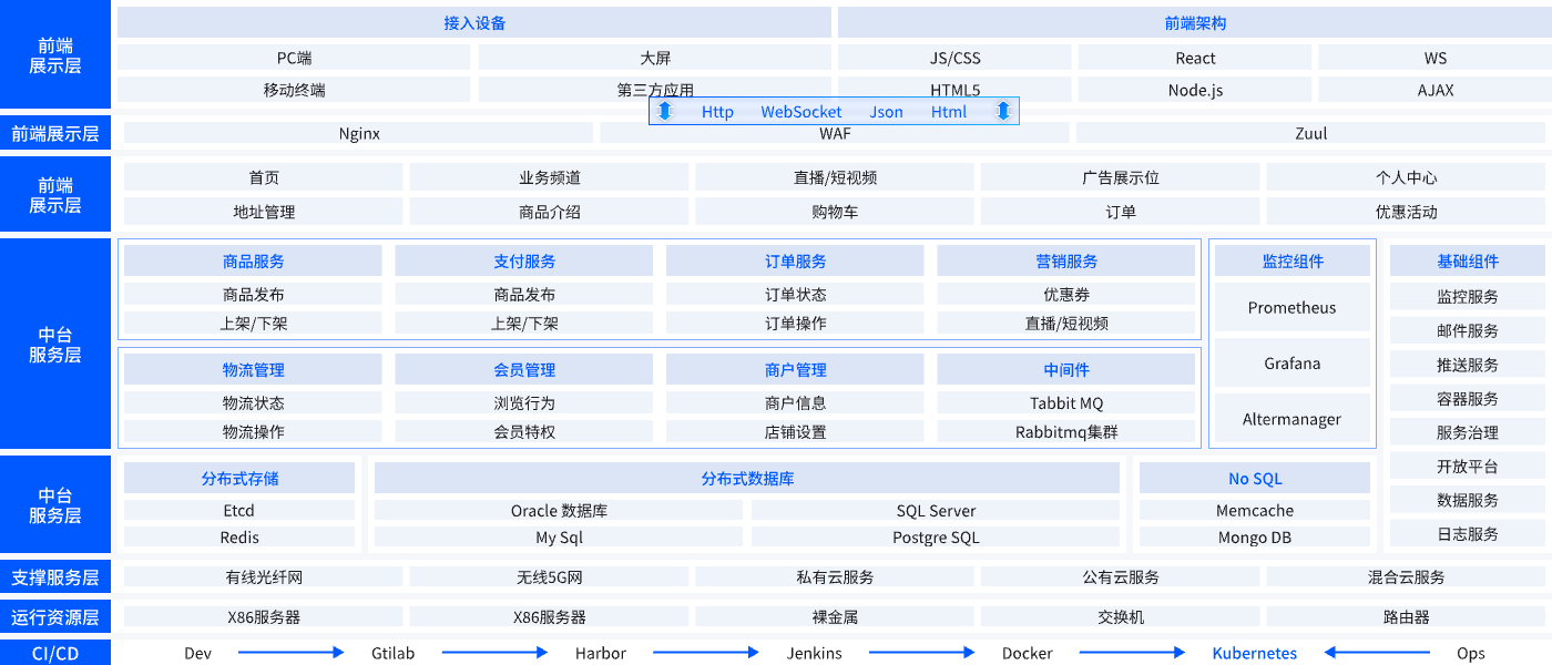 電商行業(yè)解決方案架構(gòu)涵蓋前端展示、網(wǎng)關(guān)控制、中臺(tái)服務(wù)、存儲(chǔ)技術(shù)及支撐服務(wù),確保高效、安全、穩(wěn)定運(yùn)行。