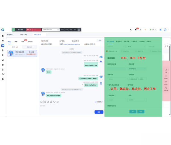 我司給茶飲品牌方提供的智能客服系統(tǒng),操作方便快捷,易上手;通過跟品牌方自有TOB、TOC工作臺集成對接,使得客服人員只需要在我司提供的熱線、在線工作臺上進行日常客戶服務(wù)等工作即可,無需在多個系統(tǒng)頁面之間進行來回的切換,方便客戶人員開展工作的同時,也大大提高了客服人員的工作效率。