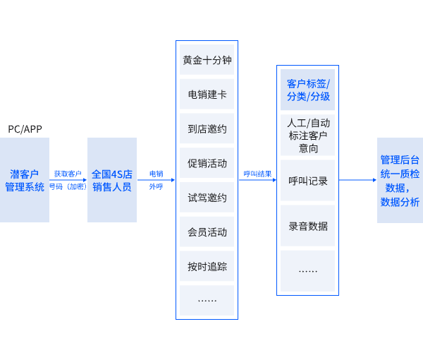 基于靈活的開放PaaS平臺,我們利用標(biāo)準(zhǔn)化API接口無縫對接汽車公司的多源數(shù)據(jù),包括客戶檔案、車輛數(shù)據(jù)、工單處理、銷售記錄、預(yù)約信息及告警通知,實現(xiàn)數(shù)據(jù)實時同步與深度整合。這一方案不僅促進(jìn)了信息流通,更驅(qū)動了業(yè)務(wù)智能化升級與精準(zhǔn)決策。