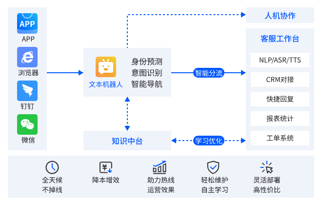 相比人工客服,文本機(jī)器人無(wú)需休息、培訓(xùn)成本低,且能高效處理大量咨詢(xún),有效減輕人工客服壓力,降低企業(yè)運(yùn)營(yíng)成本。
