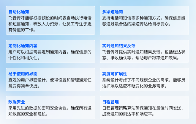 飛音傳呼是告別繁瑣的通知流程,讓機(jī)器人幫你一鍵搞定郵件、電話、短信等多種通知方式,確保信息準(zhǔn)確無誤地傳達(dá)。
