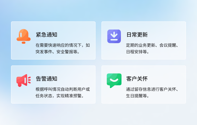 解決企業(yè)的活動通知、客戶關(guān)懷、產(chǎn)品推廣、上課通知、貨物到達(dá)提醒等場景。